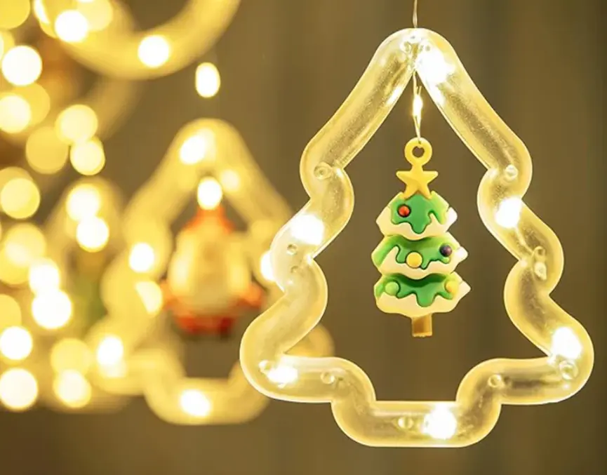 🪅Cortina de luces navideñas con LED de color blanco cálido, con 10 lindos colgantes (Santa Claus*2/Reno*2/Árbol de Navidad*2/Sombrero de Navidad*2/Muñeco de nieve*2) que brillan cálidamente, se suma a la sensación de ambiente navideño.